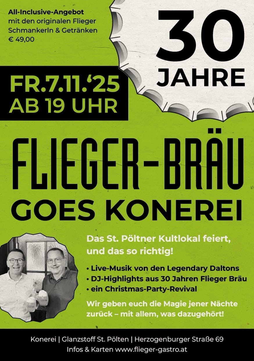 30 Jahre Flieger Bräu Ticket-Bestellung Reservierung online IST nicht mehr möglich, jedoch Sind Karten an der Abendkassa erhältlich. Freitag 07. November 2025 Einlass: 19:00 UhrFlieger Schmankerl und Getränke inklusive 20:30 Uhr„The Legendary Daltons“ Live 01:00 UhrSperrstunde